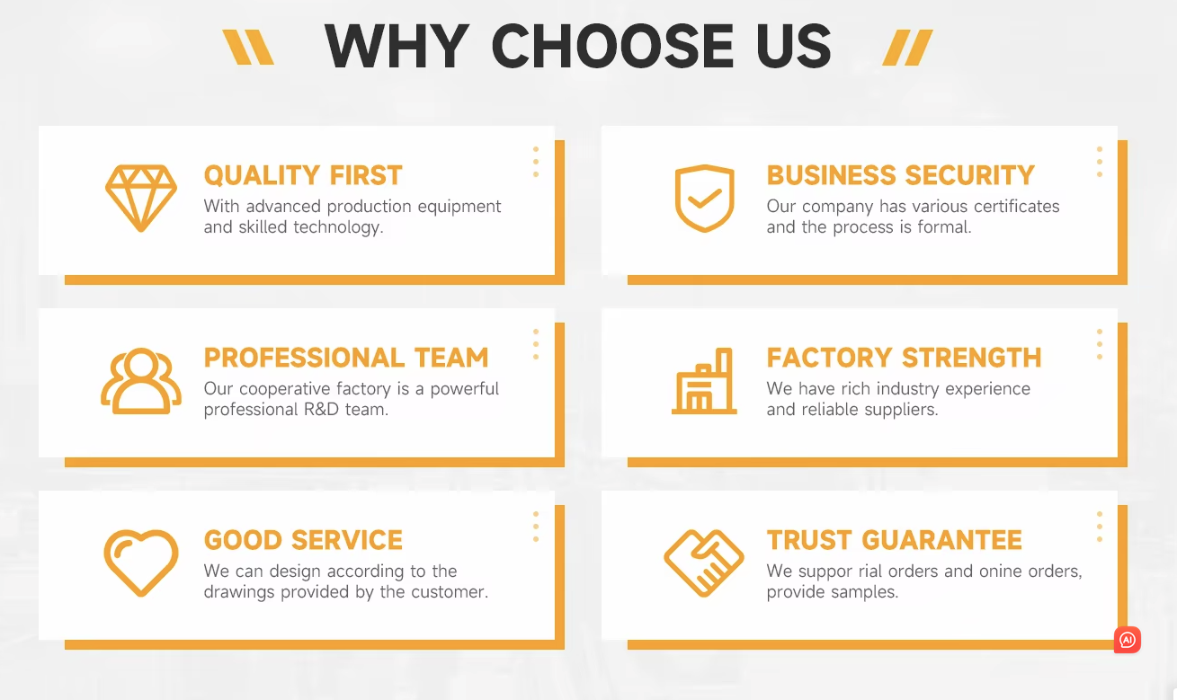 The company has various certificates and the process is formal.We have rich industry experience and reliable suppliers,with advanced production